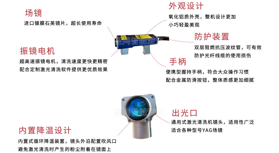 多学科融合的高学历高素质人才团队,研发了激光清洗专用光源,并针对不同清洗对象进行个性化设计,且拥有多款完全自主知识产权的激光清洗装备关键部件。 其中激光清洗枪头自主研发,重量不等,8种波形可选,在保障效率和清洗质量的同时,兼顾便携性、灵活性、环保性,功能强大。